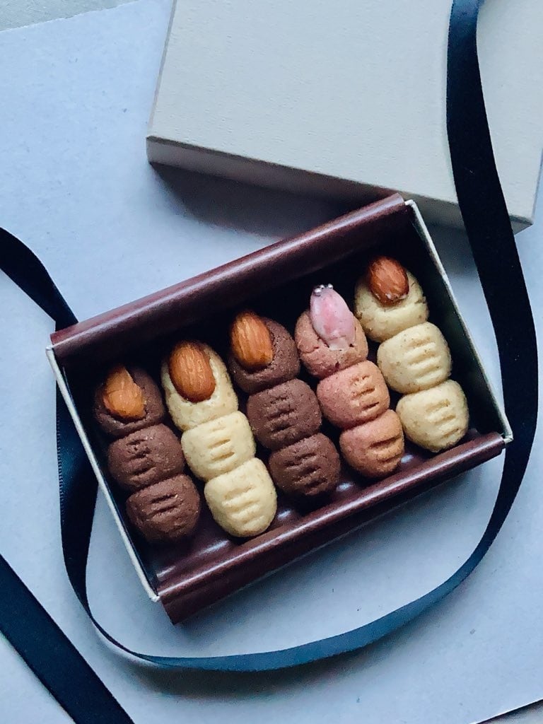クッキーは、全粒粉プレーン、全粒粉ココア、いちごの3種。ネイルの色は変わることもあります。