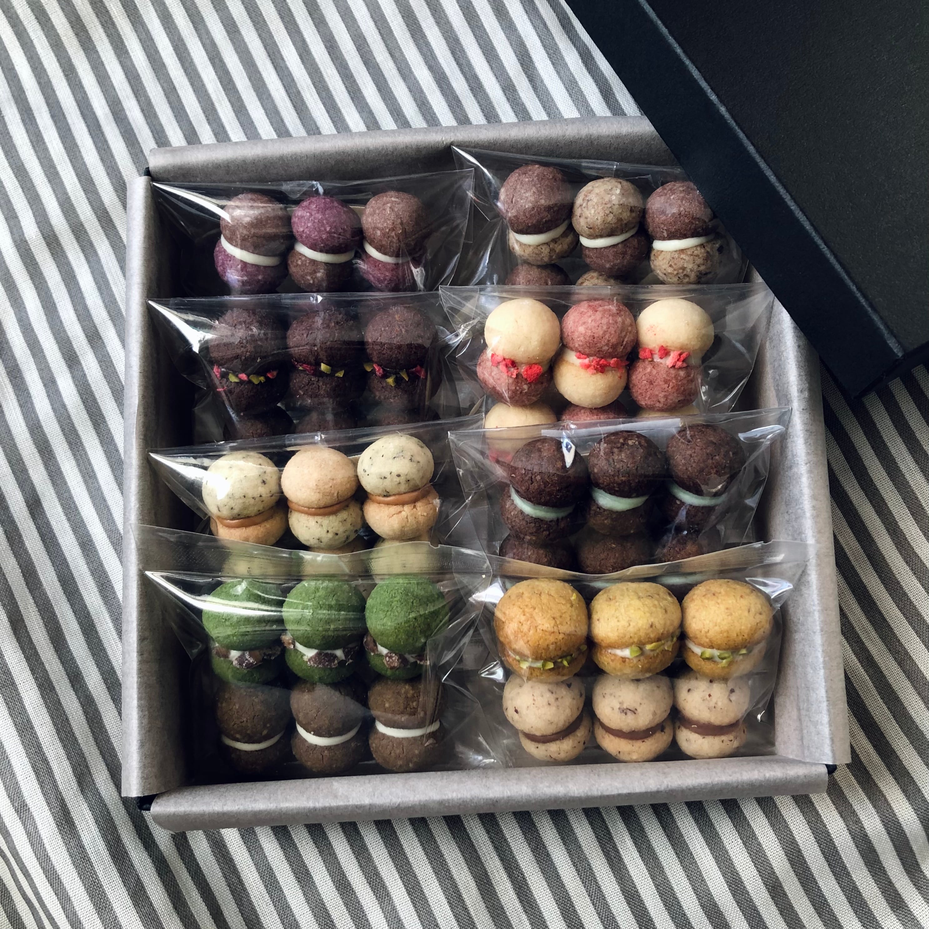 原材料名/国産米粉、鳥取大山バター、アーモンドプードル、砂糖、ピスタチオプードル、ヘーゼルナッツパウダー、くるみパウダー、チョコレート、さらしあん、黒ごま、きな粉、紫いも粉、いちごパウダー、抹茶パウダー、ほうじ茶パウダー、いちごフレーク、ピスタチオ、豆乳