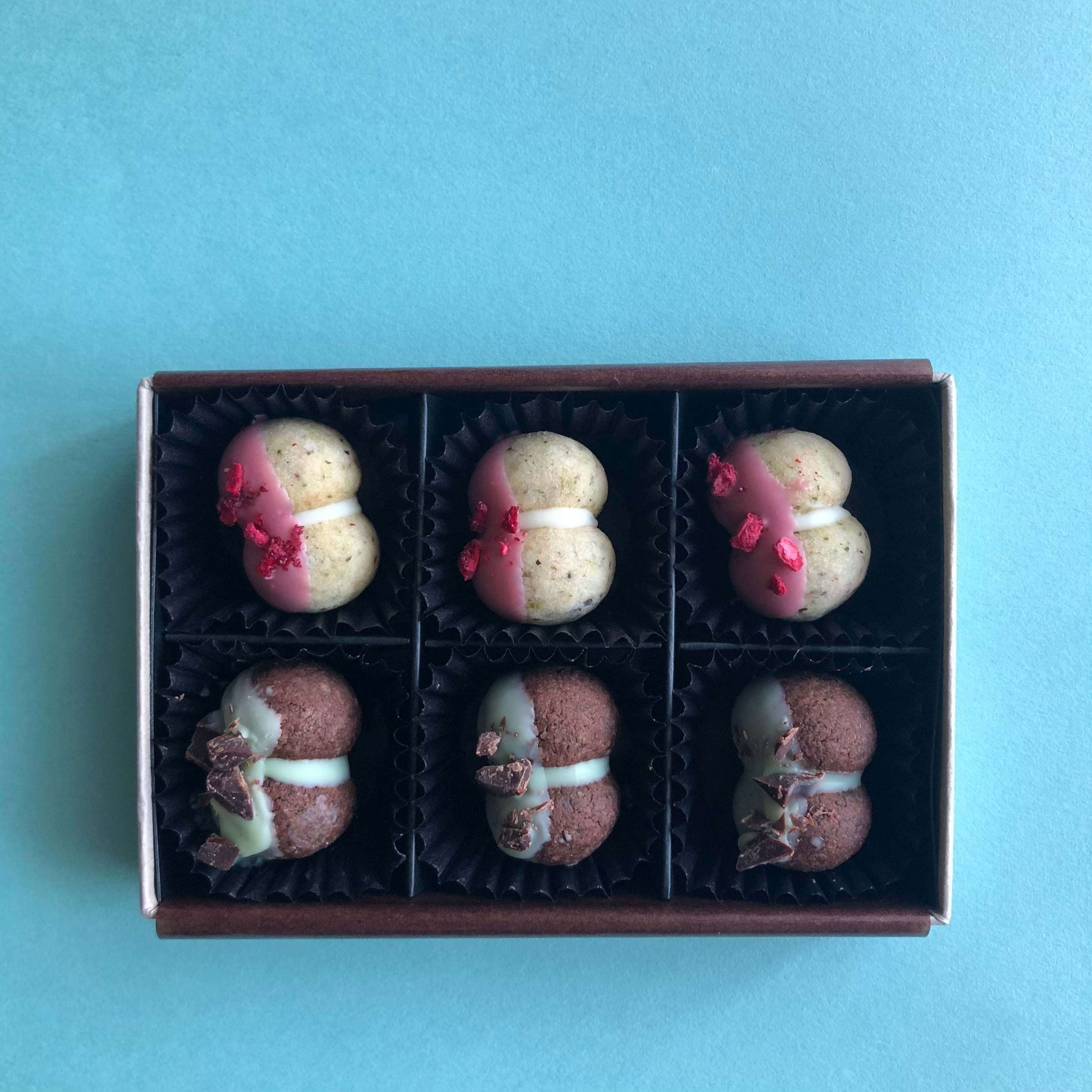 ドライペパーミントと刻んだビターチョコを加えて焼き上げたクッキーに、ミント風味のホワイトチョコをサンドし、ピンク色のルビーチョコレートでハーフコーティング。ドライラズベリーを飾って、甘酸っぱさと華やかさをプラスしました。