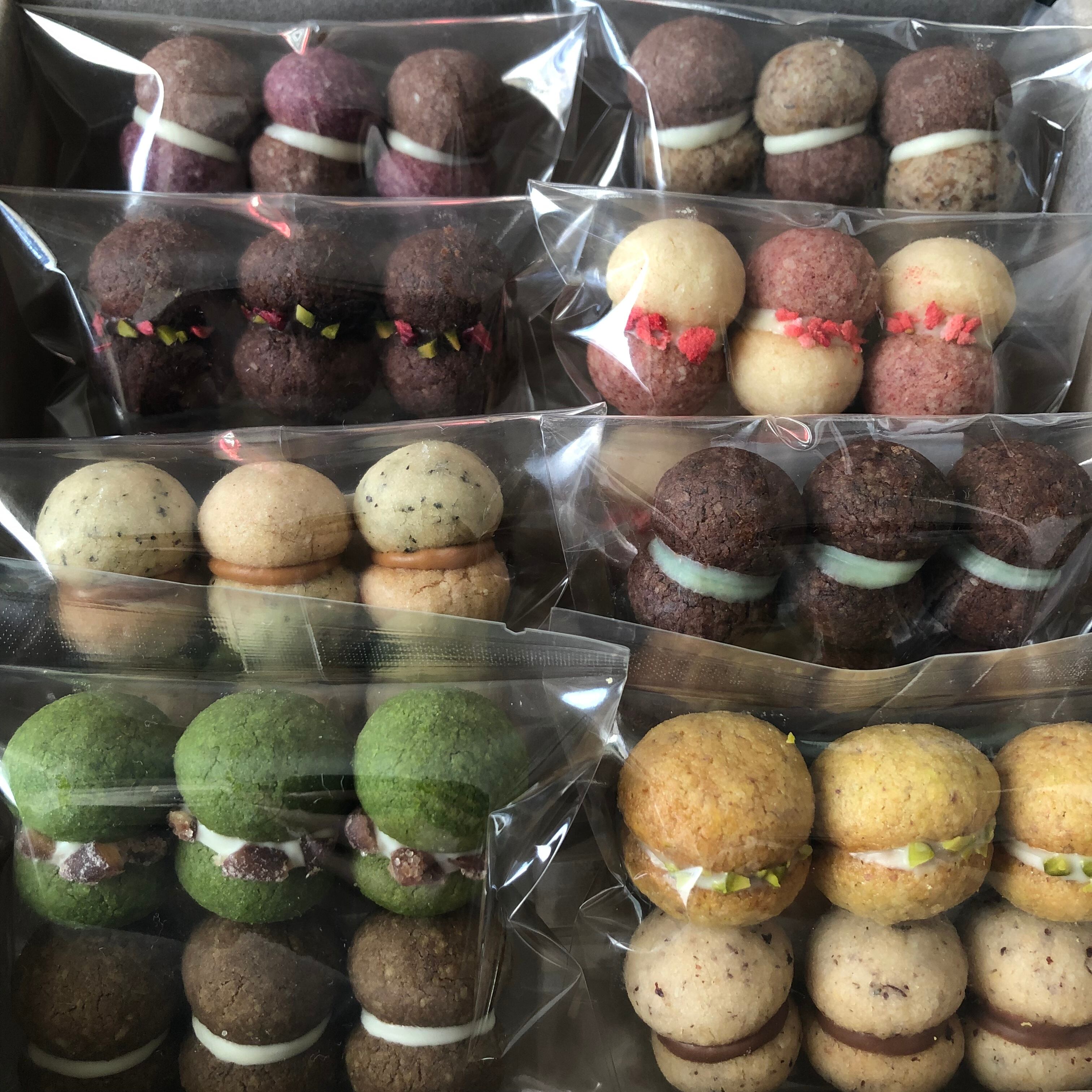 原材料名/国産小麦粉、鳥取大山バター、アーモンドプードル、砂糖、ヘーゼルナッツプードル、ピスタチオプードル、ココアパウダー、いちごパウダー、チョコレート、カカオニブ、カカオマス、コーヒーパウダー、抹茶パウダー、ほうじ茶パウダー、ミント、スパイスティー、シナモンパウダー、いちごフレーク、ドライラズベリー、アラザン